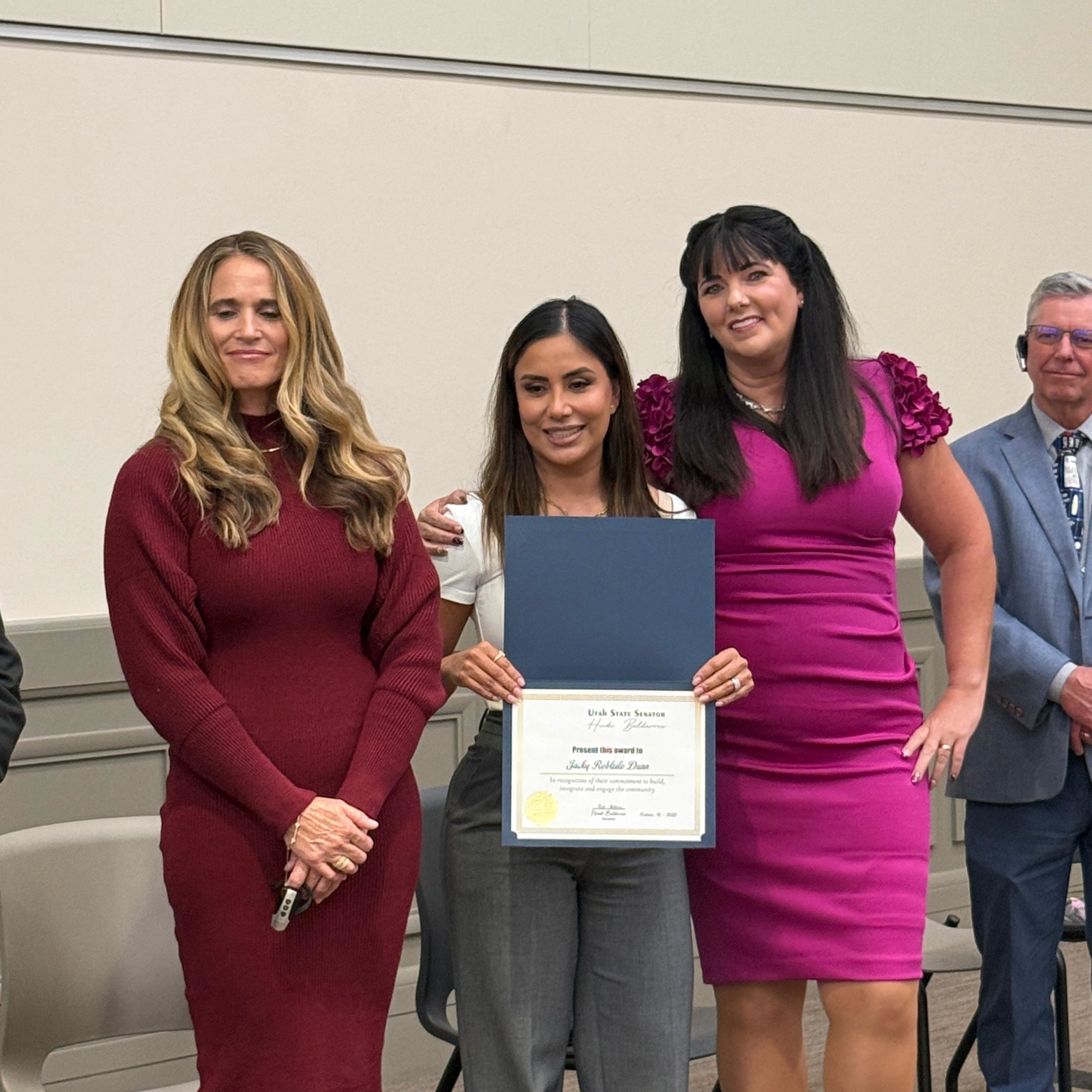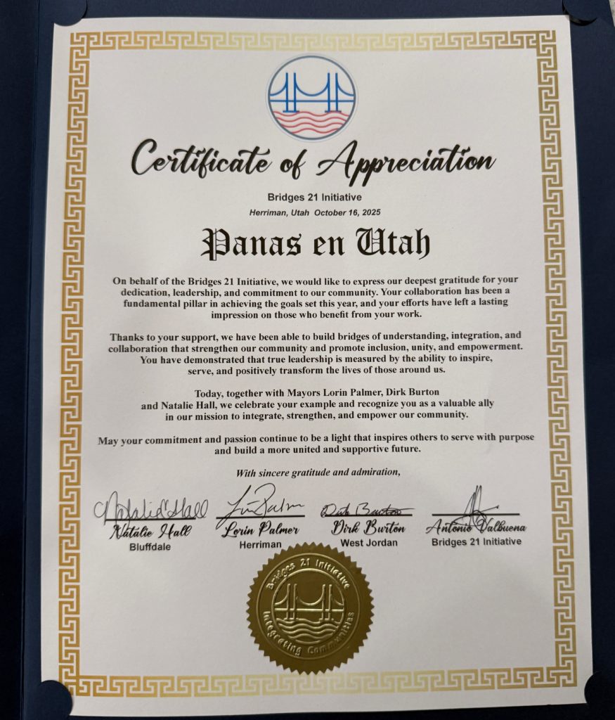 Durante la ceremonia, Panas en Utah recibió un Certificado de Apreciación en reconocimiento a su trabajo constante en la promoción de la inclusión, la unidad y el empoderamiento comunitario. Este gesto destacó el rol de la organización como puente entre la comunidad latina y las instituciones locales, fortaleciendo los lazos entre los residentes y las autoridades estatales.