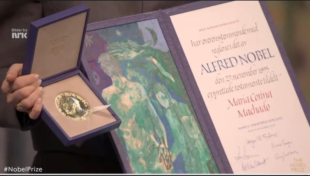 La mañana de este martes 9 de diciembre, el Comité del Nobel confirmó que mantenía la esperanza de contar con la presencia de la dirigente, aunque su arribo no ocurriría a tiempo para subir al escenario. Más tarde, difundieron el audio de la llamada entre Machado y Jørgen Watne Frydnes, presidente del Comité. Allí, la opositora venezolana avisó que se dirigía al aeropuerto y que estaba lista para abordar un avión rumbo a Noruega, consciente de que la premiación avanzaría sin ella.